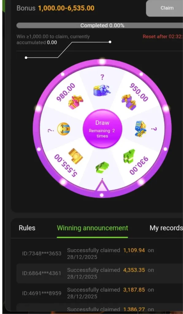 Users get daily spin rewards. Maintaining a daily streak increases bonus chances.
